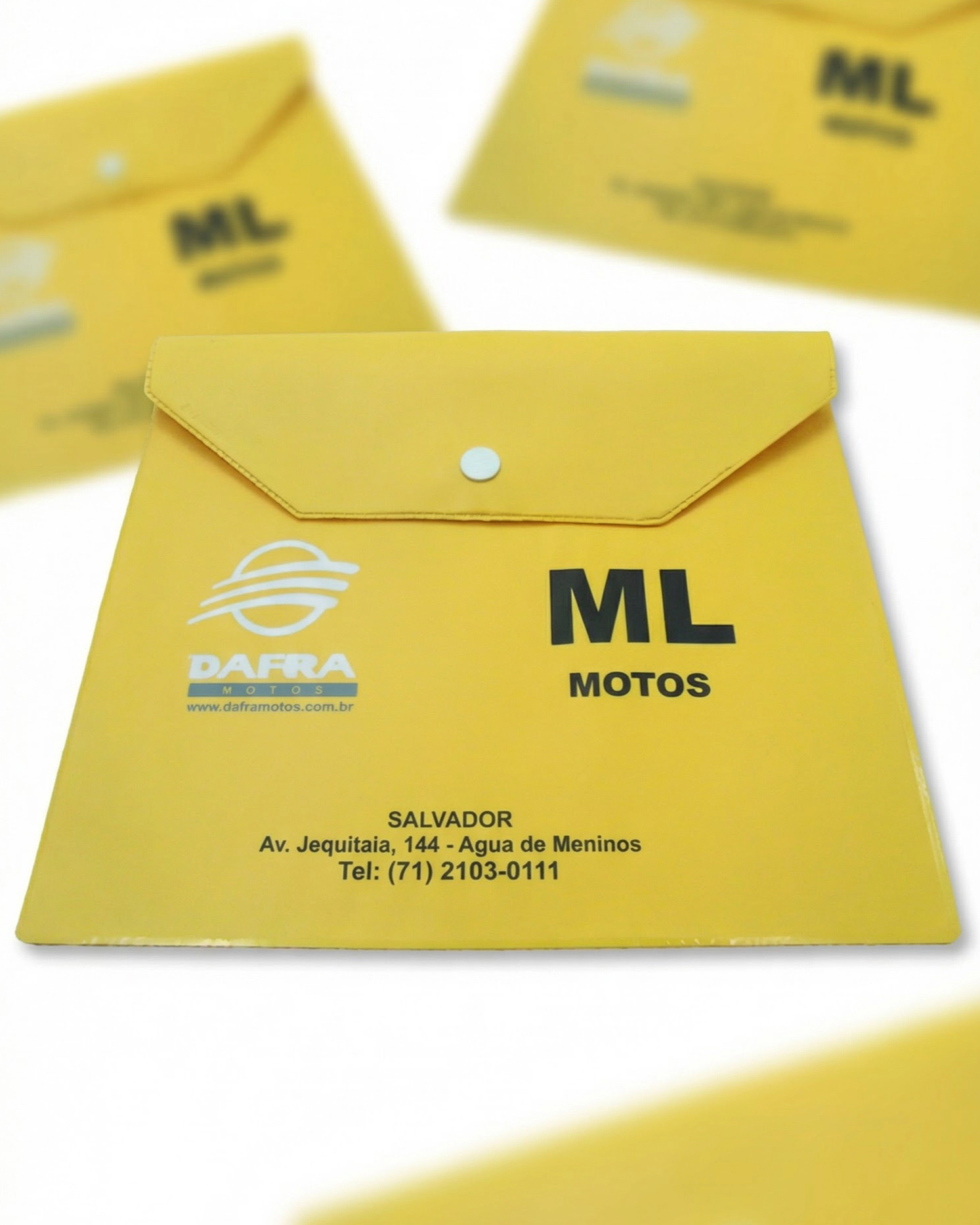 Capa em material resistente com fechamento em botão, ideal para proteger manuais e documentos contra umidade e dobras. Oferece excelente área frontal para impressão personalizada de concessionárias e oficinas mecânicas.