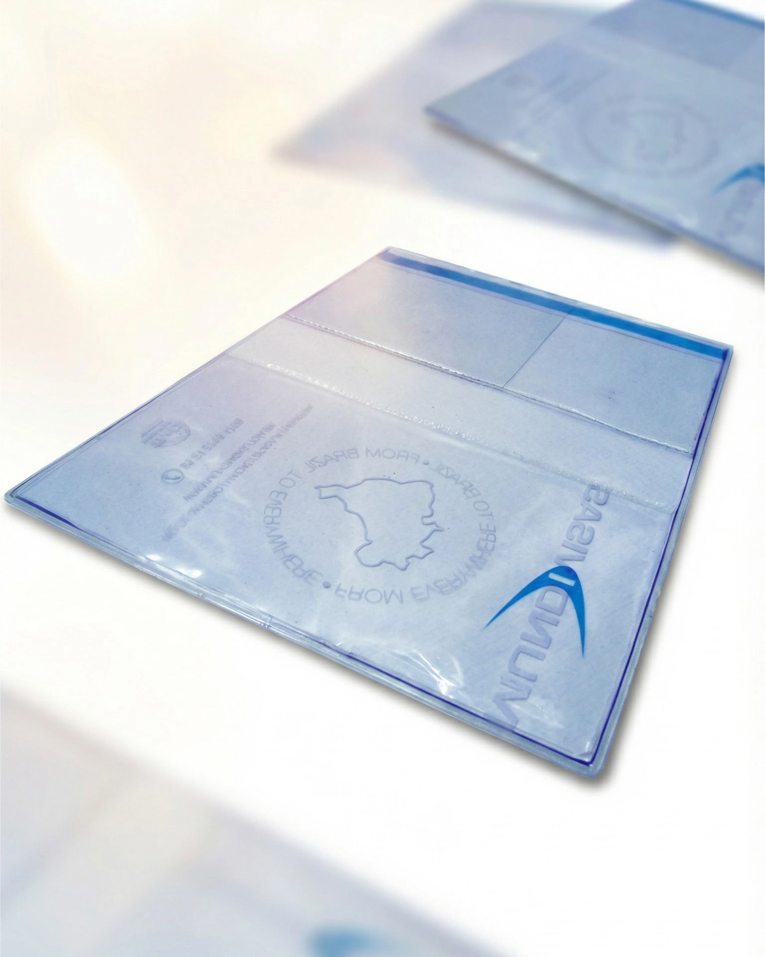 Capa protetora em material flexível e transparente, ideal para manter o passaporte conservado e livre de danos durante viagens. Apresenta divisórias internas práticas e excelente transparência para destacar a personalização de agências de turismo e câmbio.